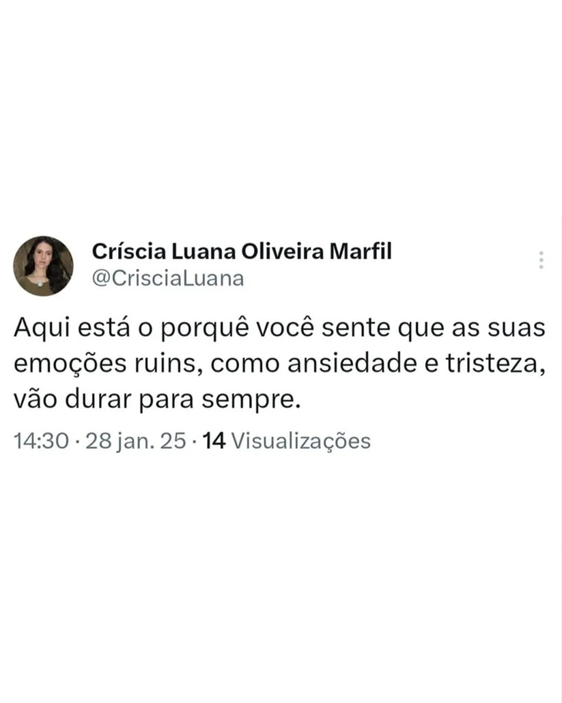 Eu sempre tive dificuldade para lidar com minhas emoções, mas com a Críscia, tudo ficou mais claro. Ela tem paciência e sempre me escuta com atenção. Aprendi a me entender melhor e a lidar com sentimentos que antes me assustavam. Hoje, me sinto muito mais preparado para lidar com as emoções em situações difíceis. Sou muito grato por todo o apoio!